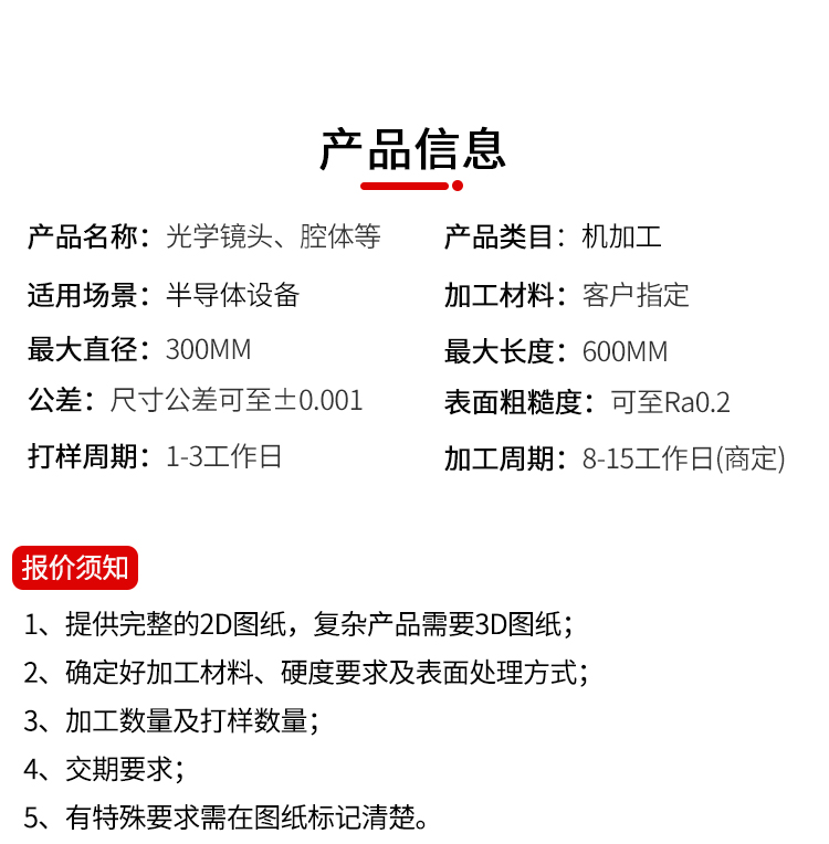 机加工类型: CNC加工中心 加工精度: 精整加工 加工材料: 特殊材料 最大直径: 300 最大长度: 600(依产品复杂程度而定) 公差: ±0. 001 表面粗糙度: Ra0 樱花视频. 05 打样周期:1-3天 加工周期:7-15天(复杂产品周期商定) 年最大加工能力:7000000套.