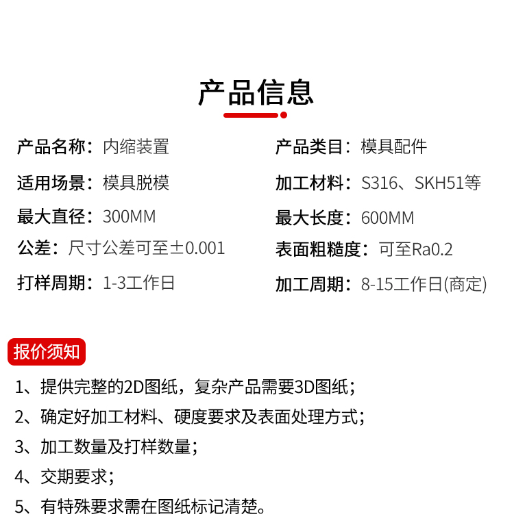 机加工类型: CNC、平面磨、镜面放电 加工精度: 精整加工 加工材料: SKH51、S316等 最大直径: 300 最大长度: 600(依产品复杂程度而定) 公差: ±0 樱花视频. 001 表面粗糙度: Ra0. 05 打样周期:1-3天 加工周期:7-15天(复杂产品周期商定) 年最大加工能力:7000000套.