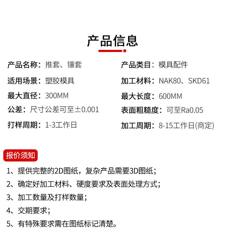 机加工类型: CNC、数控车、镜面放电 加工精度: 精整加工 加工材料: SKH51、S316等 最大直径: 300 最大长度: 600(依产品复杂程度而定) 公差: ±0. 001 表面粗糙度: Ra0 樱花视频. 05 打样周期:1-3天 加工周期:7-15天(复杂产品周期商定) 年最大加工能力:7000000套.