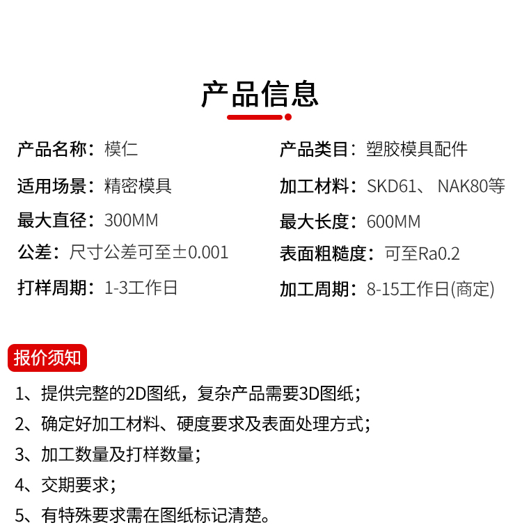 机加工类型: CNC,镜面放电、平面磨 加工精度: 精整加工 加工材料: SKD61、NAK80等 最大直径: 300 最大长度: 600(依产品复杂程度而定) 公差: ±0,001 表面粗糙度: Ra0,05 打样周期:1-3天 加工周期:7-15天(复杂产品周期商定) 年最大加工能力:7000000套 樱花视频.